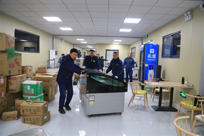 职工们身着厚重的工装,哈出的白气在灯光下凝成缕缕白雾,转瞬又消散在寒风中。负责搬运货架的男职工们,双手紧紧抓住冰冷的钢架,指节因用力而泛白,冻得通红的脸颊上却满是专注。“一二三,起!”随着号子声再次响起,沉重的货架被稳稳抬起,他们迈着稳健的步伐小心翼翼地前行,每一步都走得扎实有力。女同志们则主动扛起商品分拣、打包的重任,薄薄的手套根本抵挡不住刺骨寒意,指尖早已冻得僵硬,却依旧快速精准地将零食、日用品、粮油米面分类整理、封装标记。