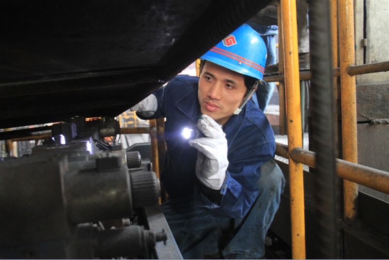 7月份厂房内的温度就像一个火炉一样炙热,设备温度达到了200度。中午1点10分,正在午休的陈超突然被一阵电话铃声吵醒,他接到班长的电话:5#机拉矫机辊不转了,需要在线更换!接到电话的他立即从学习室凳子上起来,马不停蹄地赶往生产现场!10分钟过去了,只见他拿着手电筒纹丝不动的盯着出问题的拉矫辊,脸也被已烤得通红,汗水刚一落地就瞬间变成了蒸汽!让我来吧,陈超接过小刘手中的扳手,直接扎进了拉矫机下面。3分钟后,只见他浑身湿淋淋的从拉矫机下面钻了出来,汗水已经让他的双眼无法睁开,可就在这时,班长急匆匆的赶了过来,说6#机振动减速机立板出现故障,话音刚落就不见了他的身影,只见他喝了口水就直接奔向了6#机二冷室,旁边的小郭喃喃自语到,超哥真是个铁人啊!抢修一直持续到8点,7个多小时的连续作业使他身心疲惫,从二冷室出来的那一刻他身上的衣服早已浸透,但他没有任何怨言,只是静静坐在墙角眼睛盯着操作台,直到顺利开浇,他才默默的离开现场……