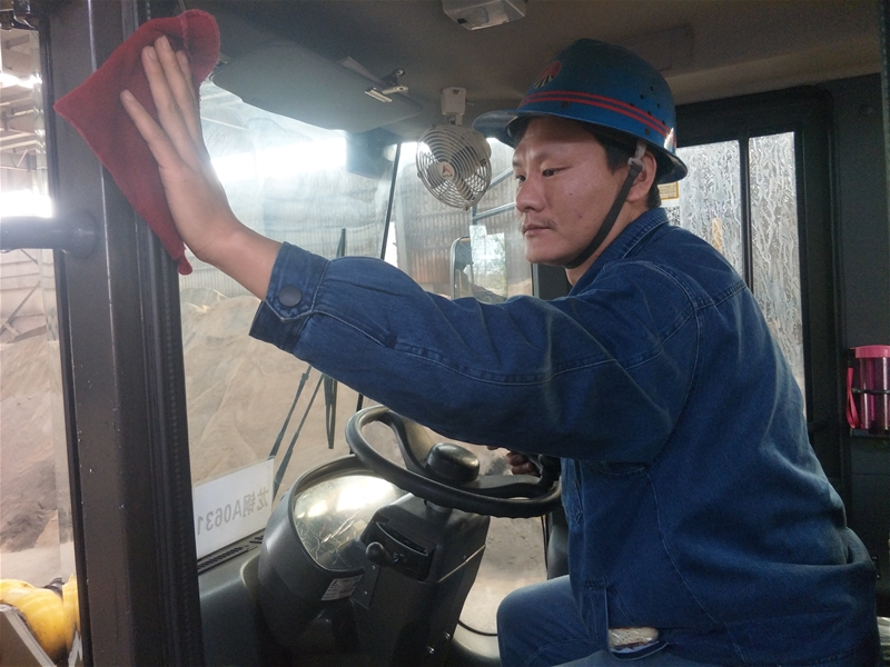 汽车班驾驶员程铁禄正在认真擦驾驶室