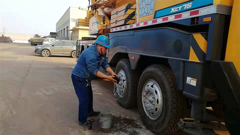 吊车班驾驶员陈向阳正在清洗75吨吊车