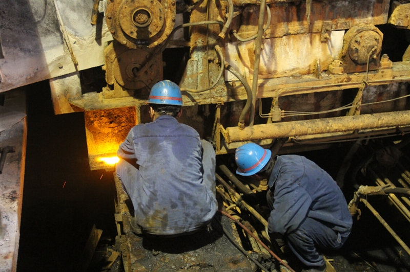 随后大家便一起奔赴到4#机,通过现场确认在派工单上签上自己所属职责的签名以及与生产班长联系确认后,检修便开始了。更换引锭头、校正支撑棍、拉矫系统检查维护……一项项检修任务都有条不紊的进行开来。其中的更换引锭头是更换铸坯断面的重头戏,彭方宝带领着几个人还没等拉矫区域完全冷却下来便冲了上去。由于引锭区域地方狭小,只能靠人力将引锭头抬至每个流前,然后两人一组抬起引锭头对准了销子的位置,彭方宝眼看引锭头漏出了圆圆的销孔,立刻一手拿起销子,一手拿着榔头,使劲地击打着,一下、两下、三下……没几下的功夫,销子便被完全打了进去,“走!”,满头大汗的他们顾不上喝一口水,又向下一个流奔去……