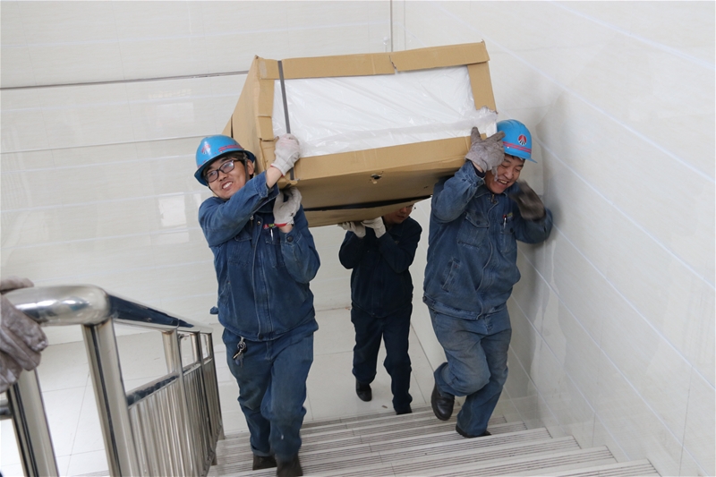 由于衣柜在卡车上装载较高,单个柜子体积较大,且要统一搬到二楼更衣室里,卸车、搬运难度大。志愿者们经过简单商讨分工后,卸、接、搬、运有序展开,俩人一组卸下衣柜,四人一队肩扛衣柜,喊着统一的号子,迈着有力的步伐,运往二楼。虽已是早春,但春寒料峭,风有些冽,天有些冷,但丝毫没有影响志愿者们的劳动热情,不一会个个都满头大汗,他们却擦干汗水,顾不上多喝一口水继续投入战斗。不知不觉已到午饭时间,但大家仍在埋头苦干,没有一个人主动休息、吃饭。他们的行动也感染了前来用餐的工友们,三五成群地加入到搬运队伍中,和青年志愿者一道撸起袖子干起来。经过大家的共同努力,下午一点,300个柜子被整整齐齐地搬到了二楼职工更衣室内。