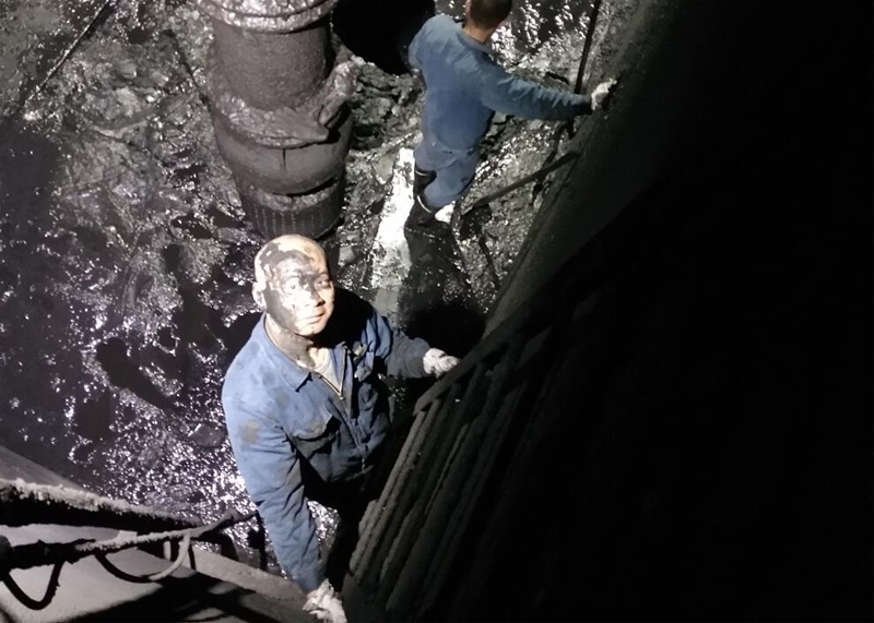 众志成城打好“歼灭战” 污水排出后,下至井底清淤的人员增至3人,清淤速度明显加快。透过狭小的井底入口孔,只见井内身影不停晃动,一锨又一锨淤泥被铲了出来,随后落入淤泥桶中被吊运出来……井上负责接替的员工随时做好下井准备,不时喊上一嗓子:“快上来,到我们了,你们已经干了一小时……”而被替换上来的人员则抓紧时间休息,为下一轮即将到来的“战斗”养精蓄锐,随着时间的推移,大家轮番作战,井底的淤泥逐渐减少。