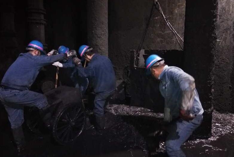 8时30分,焦健、王晋率先下至井底排污水,他们脚踩木板(防止陷入淤泥),忍受着平流池内淤泥散发出的腐蚀气味,拿起工具挖一条排水沟,使污水归槽,方便抽水泵将污水抽出。可是混着污水的淤泥不是想象中那样好清理,一锹下去,一边的淤泥又流入,但是他们不放弃,一锹又一锹,淤泥溅满他们一身一脸……一桶桶淤泥被运出,3个小时后污水排出,为清淤工作吹响了“冲锋号”。