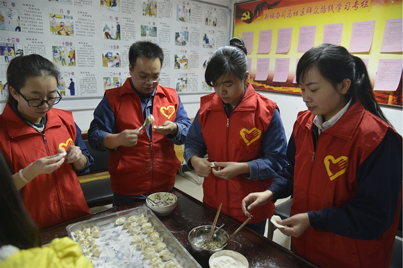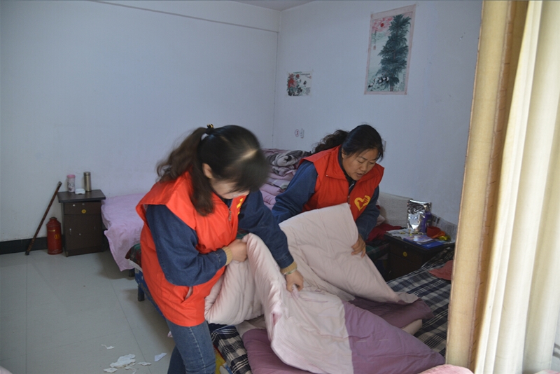 走进敬老院,志愿者们首先为老人送上了牛奶、水果和糕点等营养品,随后,自由分组开展活动,第一小组厨房帮厨,志愿者们和厨师一起为老人包饺子,和面、剁馅、拌馅、擀面皮、捏饺子……他们分工明确,相互协作,一切进行的有条不紊。第二小组整理内务,他们挽起袖子,拖地、擦桌子、整理床铺,不一会儿,敬老院的一切就井井有条呈现在老人面前。第三小组互动谈心。志愿者们和老人围坐在一起,手拉手嘘寒问暖,了解老人的饮食起居和健康状况。一名志愿者还为老人讲述了春季养生知识,告诉他们要注意保暖、保证睡眠、合理膳食、加强锻炼,还要保持良好的心情和精神状态。活动之余,志愿者们还为老人们送上了独唱《妈妈的吻》、《小城故事》,舞蹈《感恩的心》、《北京的金山上》等娱乐节目,精彩纷呈的节目为敬老院增添了许多欢快喜庆色彩,获得了敬老院老人的阵阵热烈掌声。欢声笑语中,第一小组已经将热气腾腾的饺子端上了餐桌,大家将老人们搀扶到饭桌旁,看着他们大口大口吃着香喷喷的饺子,志愿者们个个脸上都露出了开心的笑容。