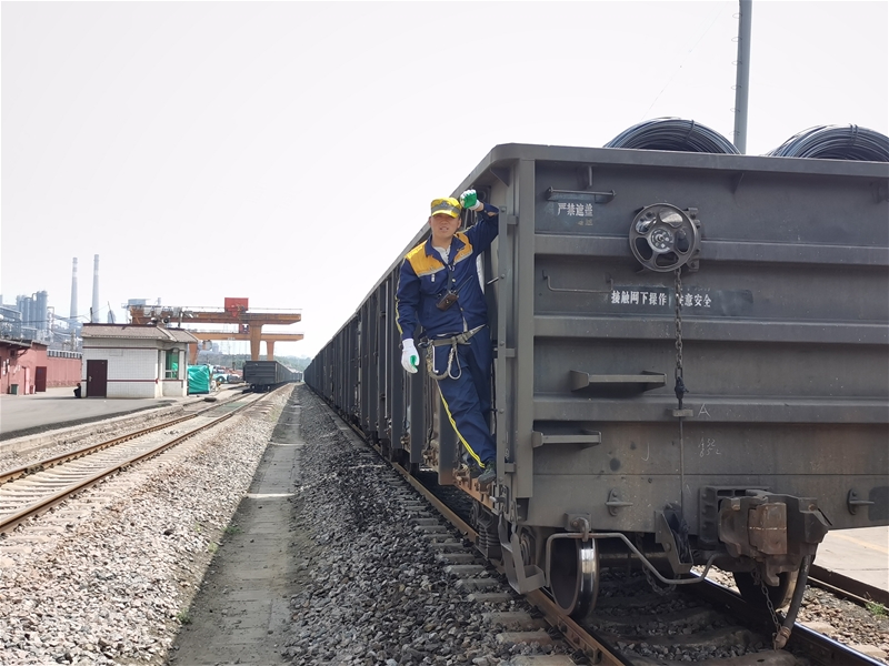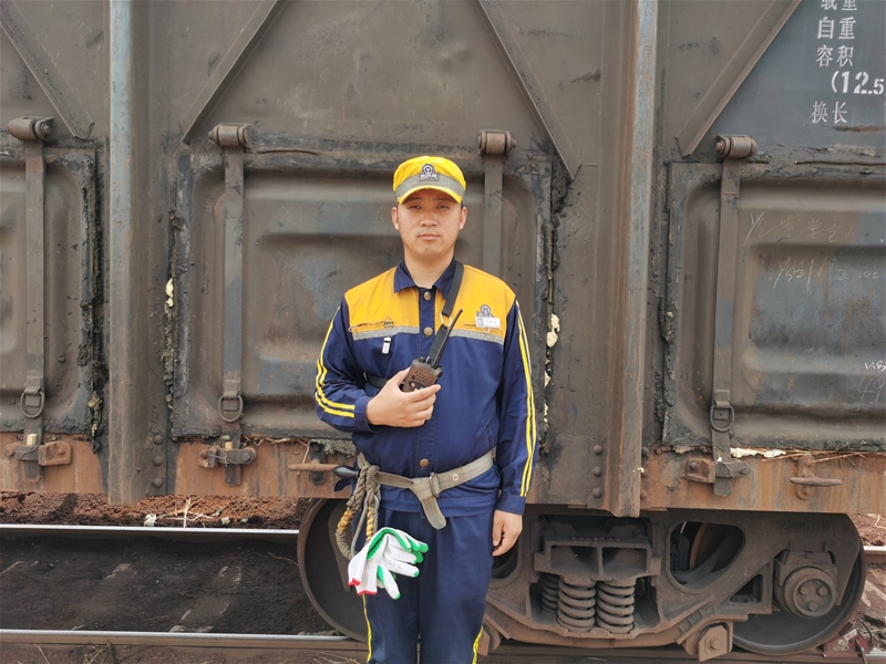 看着由远而近的一列重车,他气定神闲,做好“驯龙”准备,娴熟地跳上了一条“龙”身,“手握紧、腿蹬直、脚踩稳”,调车员这代代相传的“九字诀”他可是记得清清楚楚,只见他双手紧紧握住扶梯,身体紧紧贴住“龙身”,虽然从新站到下峪口站的距离只有短短几公里,但因为站内推进速度缓慢,高洋要保持这个动作30多分钟,即便是“驯龙高手”,一次车辆引导下来也很消耗体力。